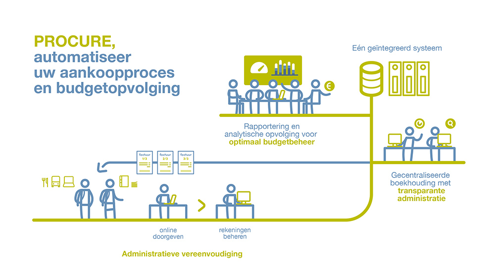 ProCure biedt u via één centraal systeem toegang tot al uw documenten (aankoopfacturen, orders, bijlagen) en systemen (boekhouding, activabeheer, leveranciersdatabase). Alle werknemer-gerelateerde onkosten (Woon-werk, Dienstverplaatsing, Fietsvergoeding, Extra onkosten, …) kunnen automatisch en/of specifiek aangevraagd worden. Dankzij de web interface en de mobiele app is het systeem overal en altijd bereikbaar.